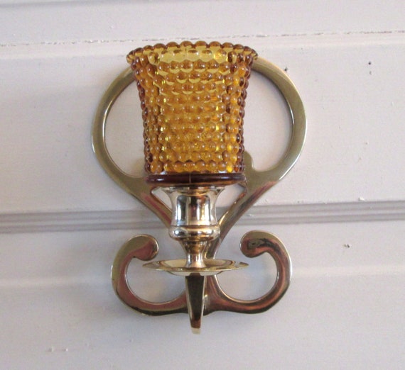 Vintage Brass Candle Wall Sconce Glass Votive Holder Amber Etsy