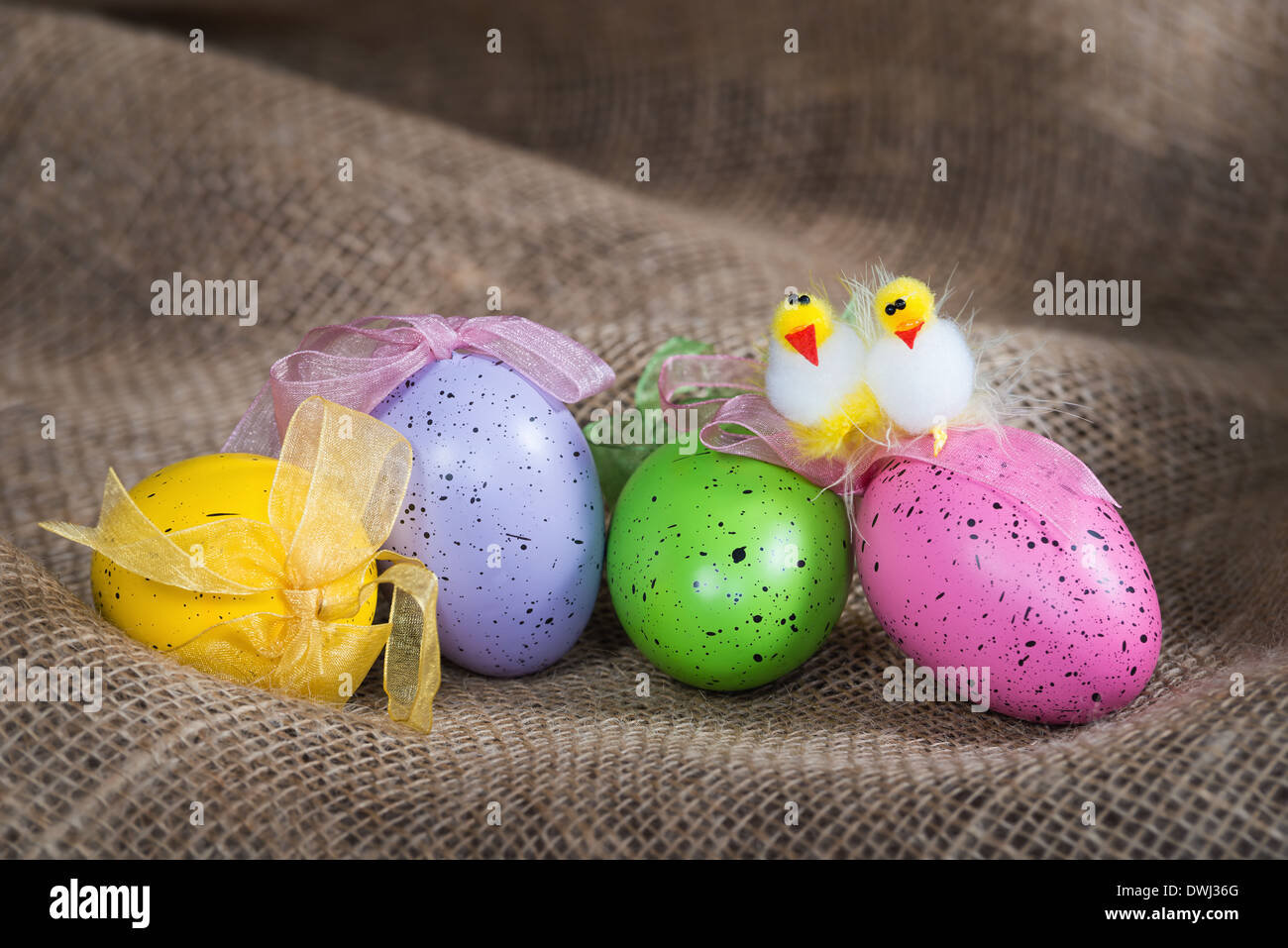 Colorful Easter Eggs And Decorative Chickens On Burlap Background