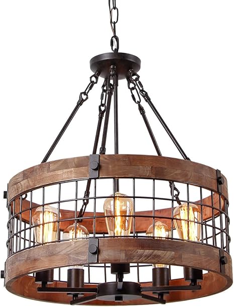 Anmytek Round Wooden Chandelier Metal Pendant Five Lights