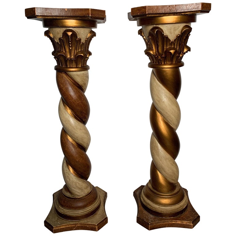 Midcentury Pair Of Carved Wood Pedestals With Decorative Faux