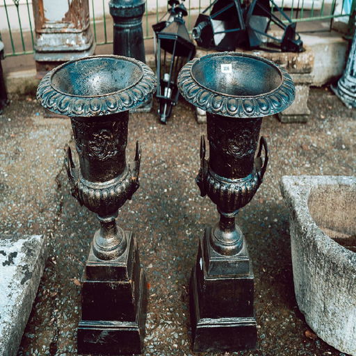 Pair Of Decorative Cast Iron Garden Urns On Pedestals Jun 26