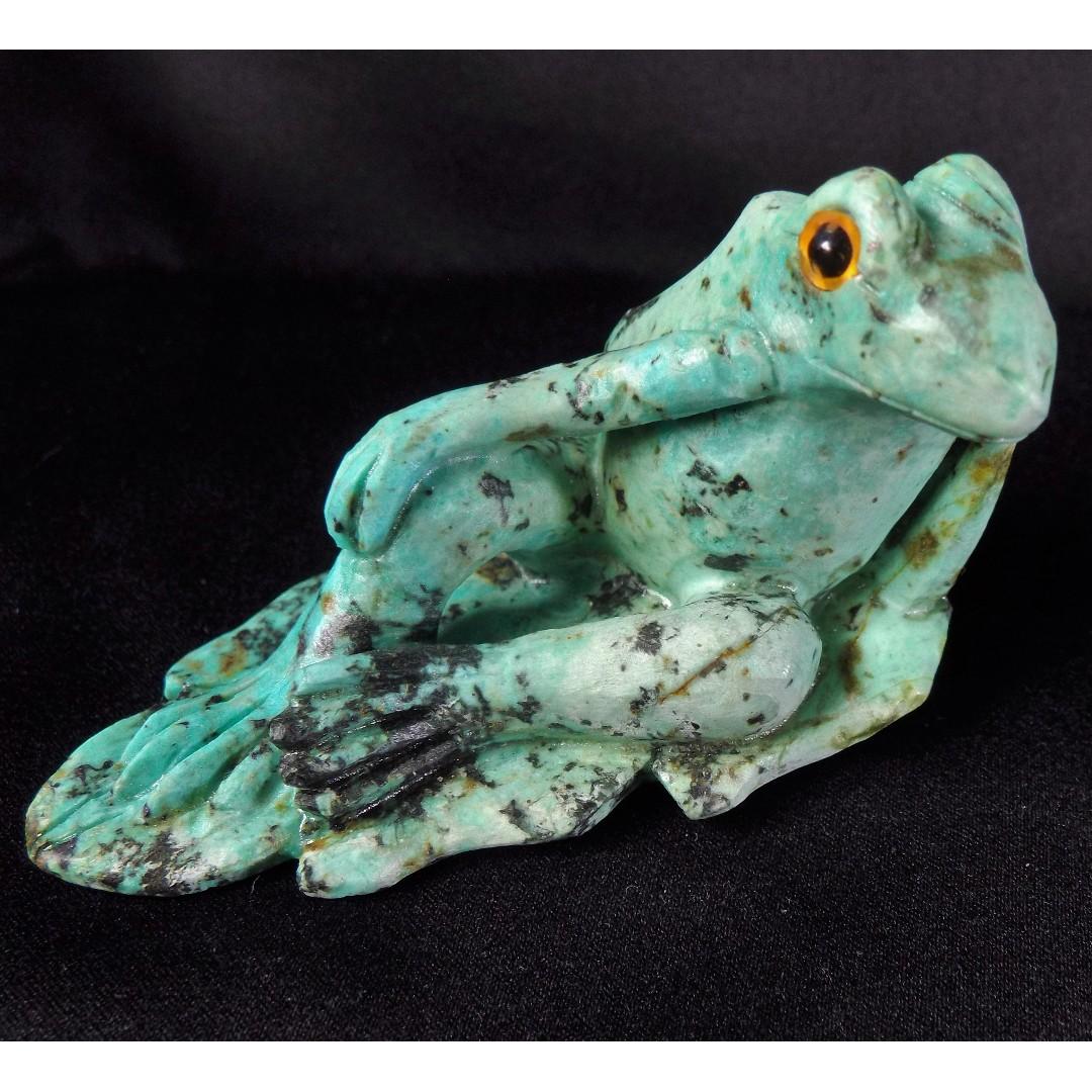 African Turquoise Hand Carved Crystal Stone Frog On Leaf Sculpture