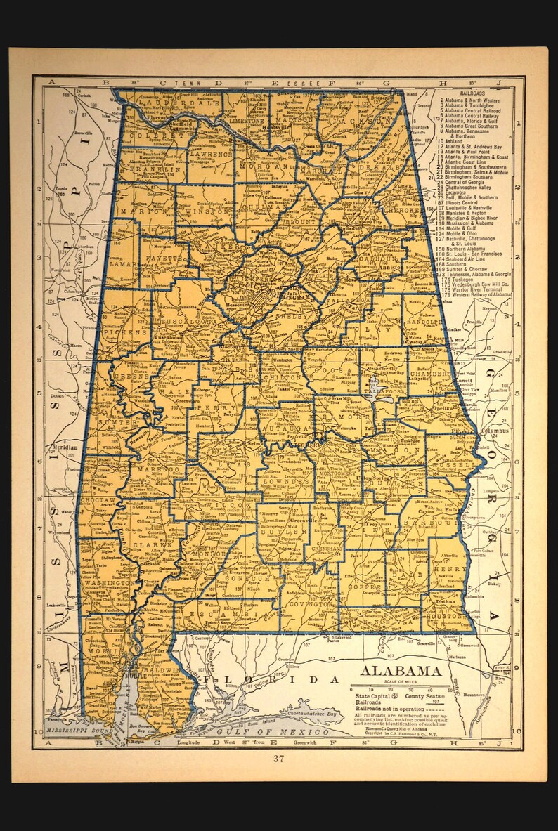 Alabama Map Of Alabama Wall Decor Art Original Railroad Etsy