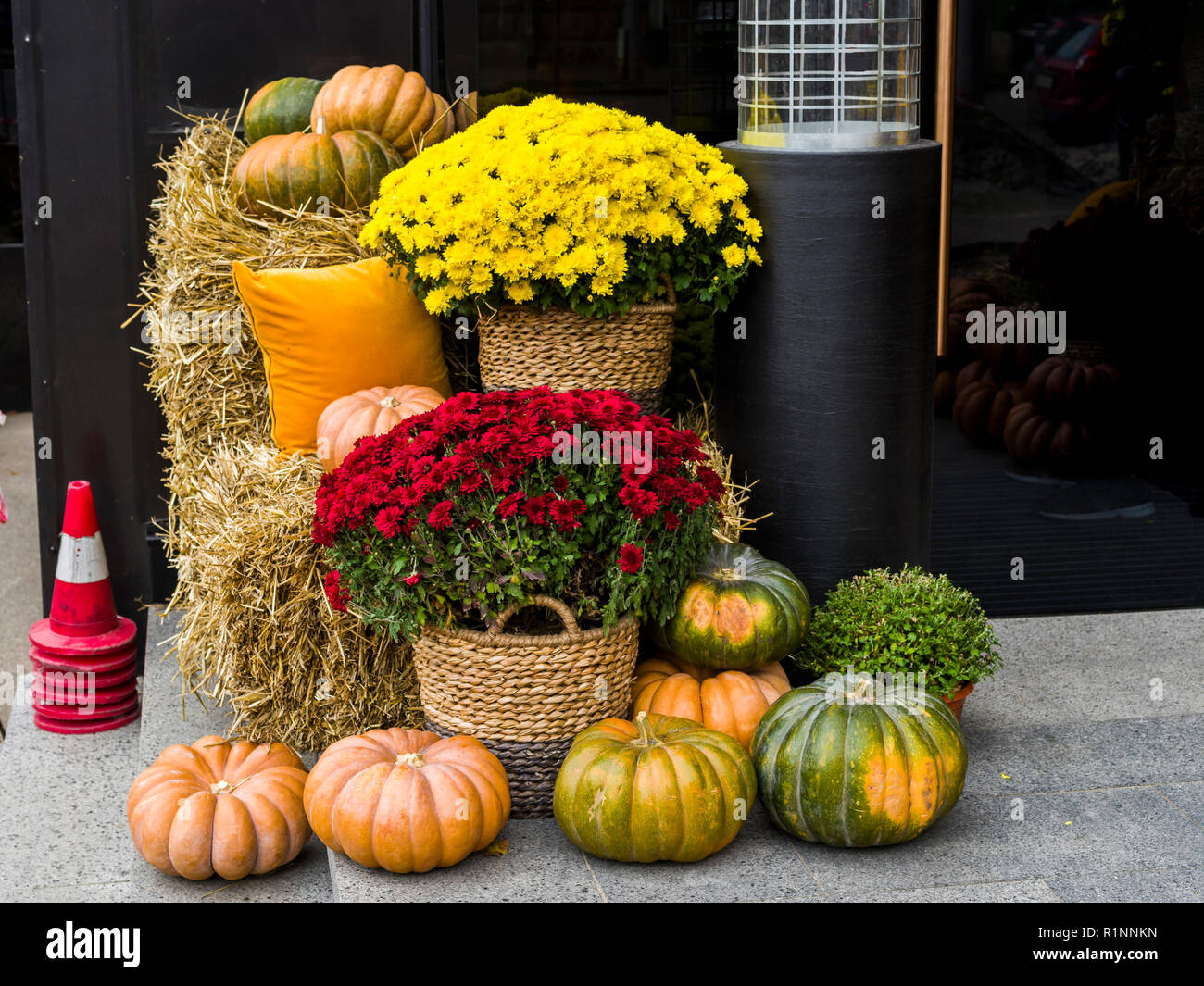 Hay And Pumpkins With Flowers In Wicker Pots And Yellow Pillows To