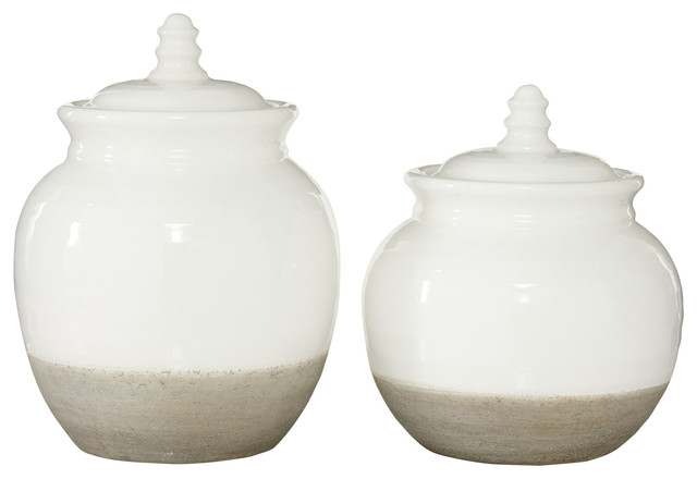 Large Round Vintage Beige White Ceramic Jars W Lids Set Of 2
