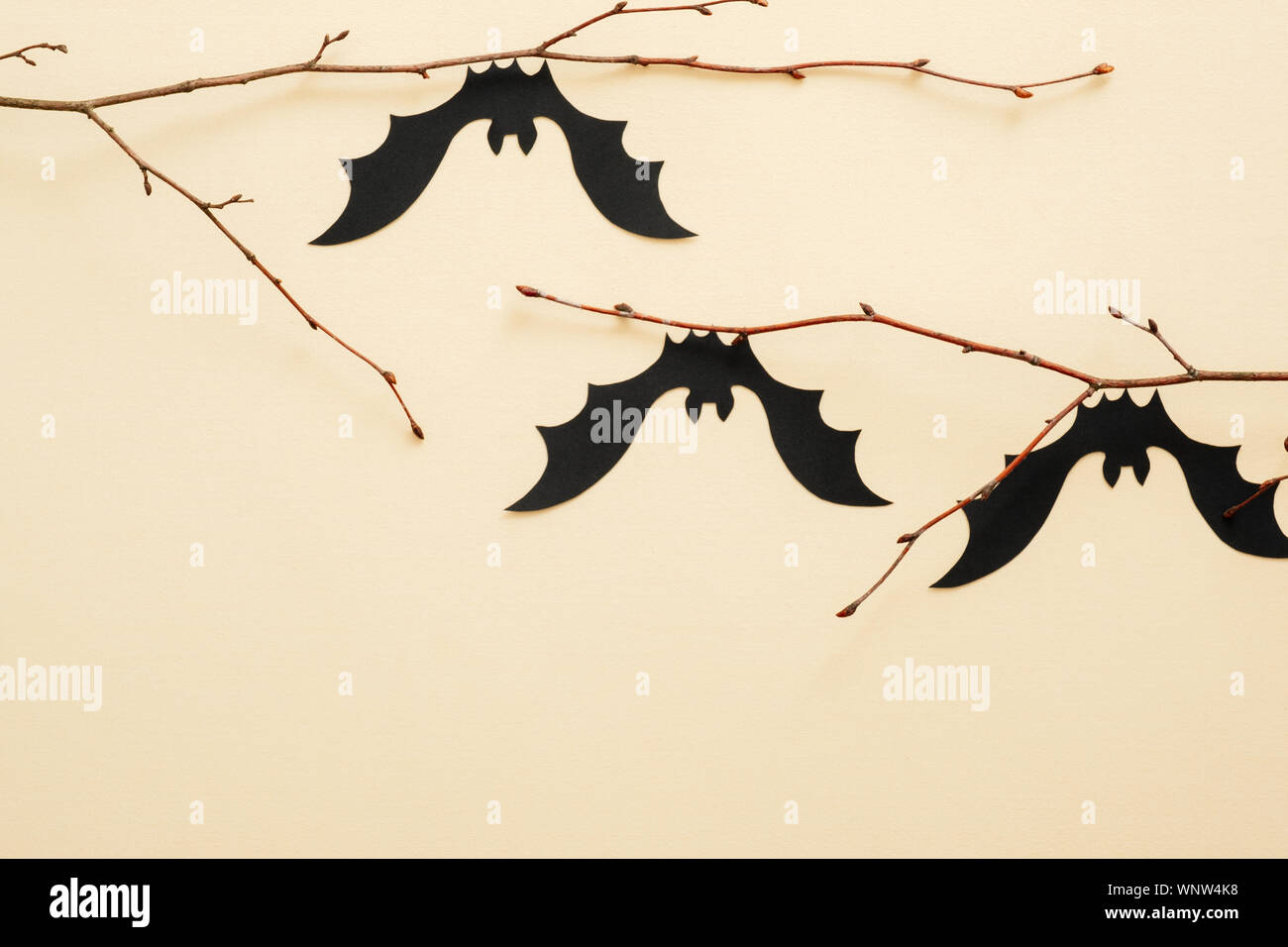 Halloween Paper Decorations On Pastel Beige Background Black Bats
