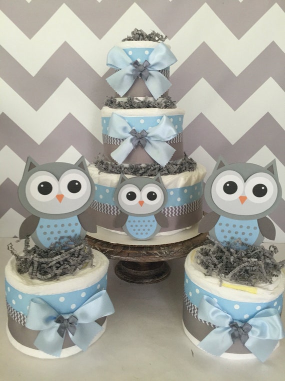 Set Of 3 Owl Diaper Cake Centerpieces In Blue And Gray Owl Etsy