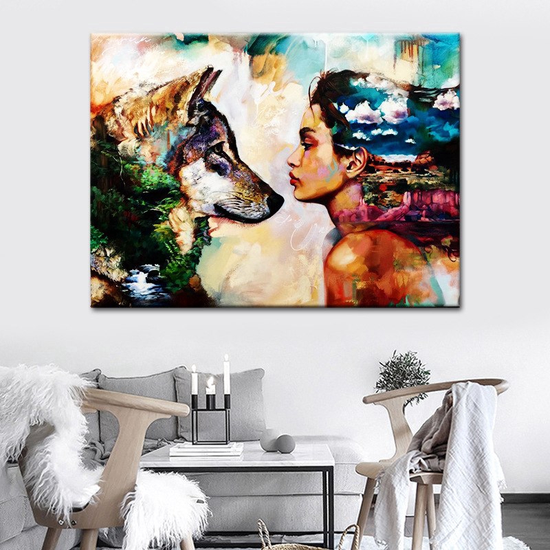 Wild Animal Painting Wolf Flowers Decor Colorful Handdrawn Sketch
