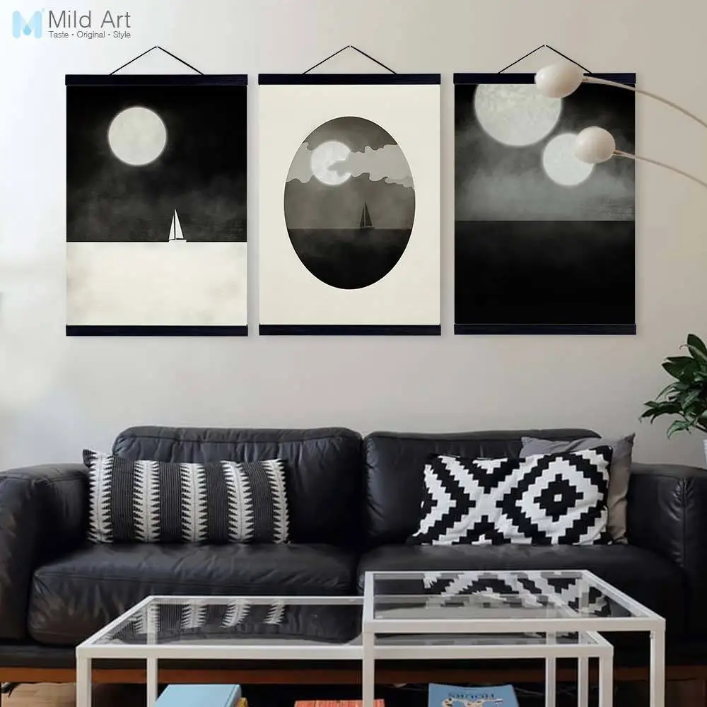Abstract Marine Sailing Moon Wooden Framed Canvas Paintings Black