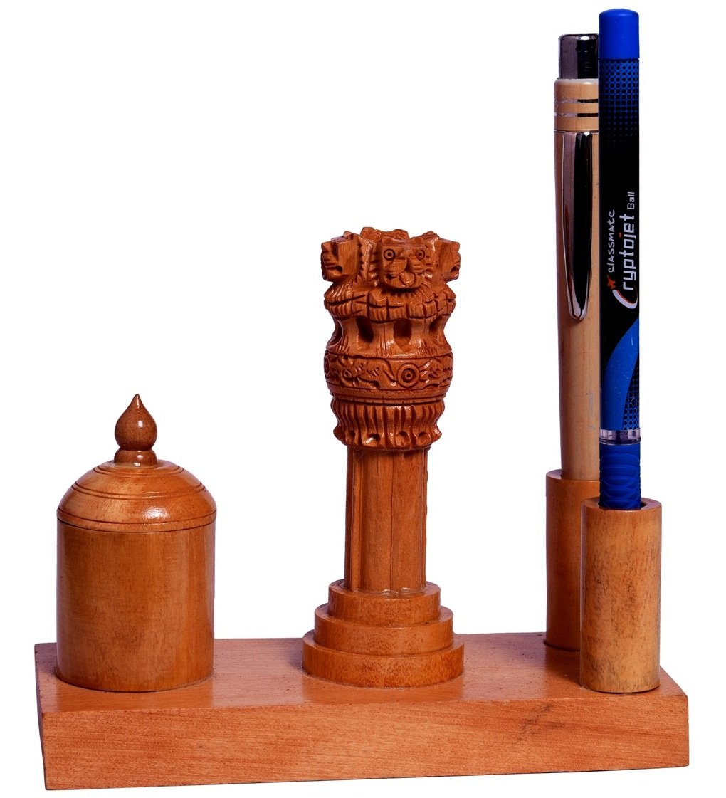 Indian Handmade Wooden Carved Ashoka Pen Stand Pin Holder With