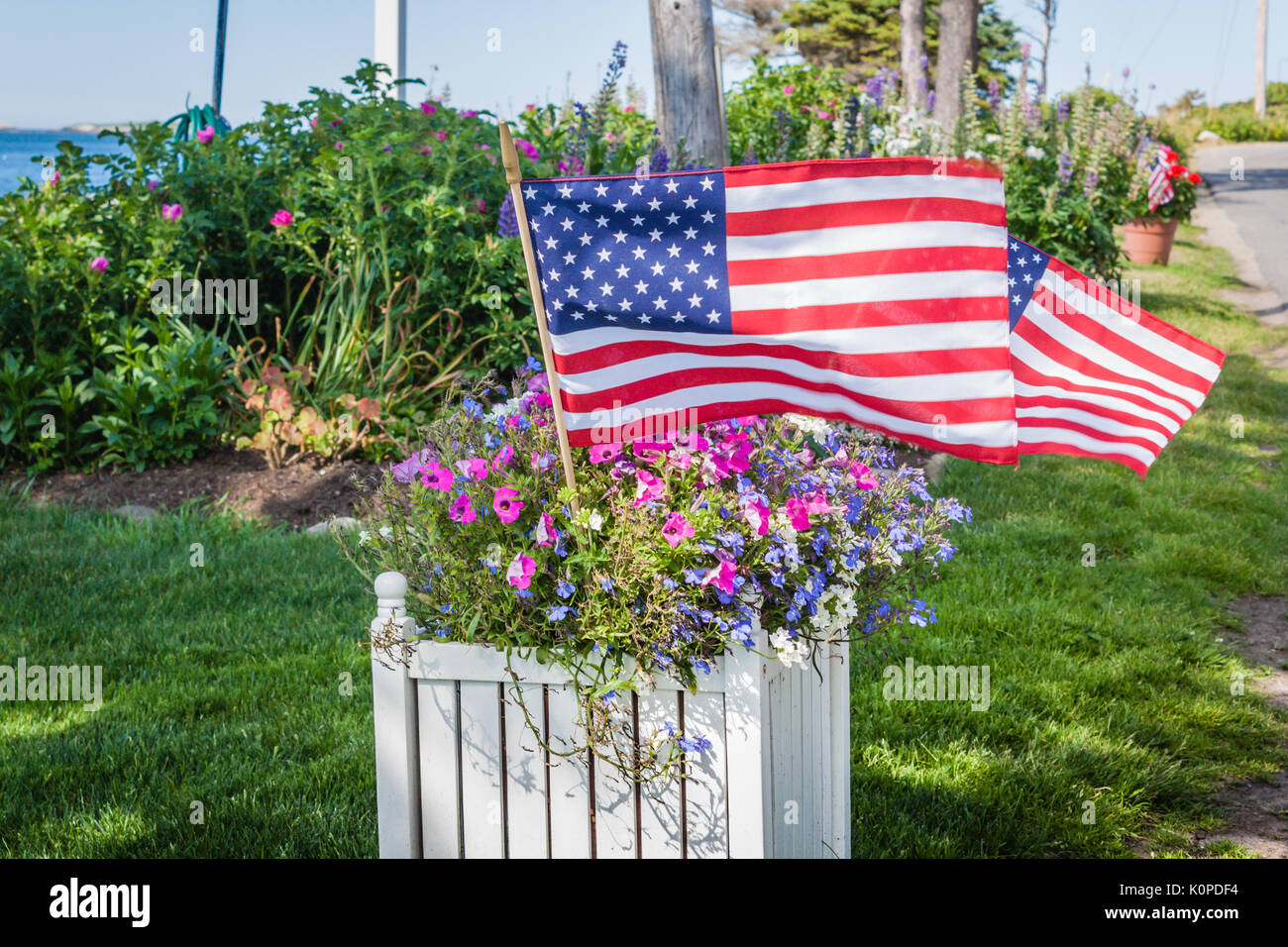 American Flags In A White Planter Box For Patriotic Decor Stock