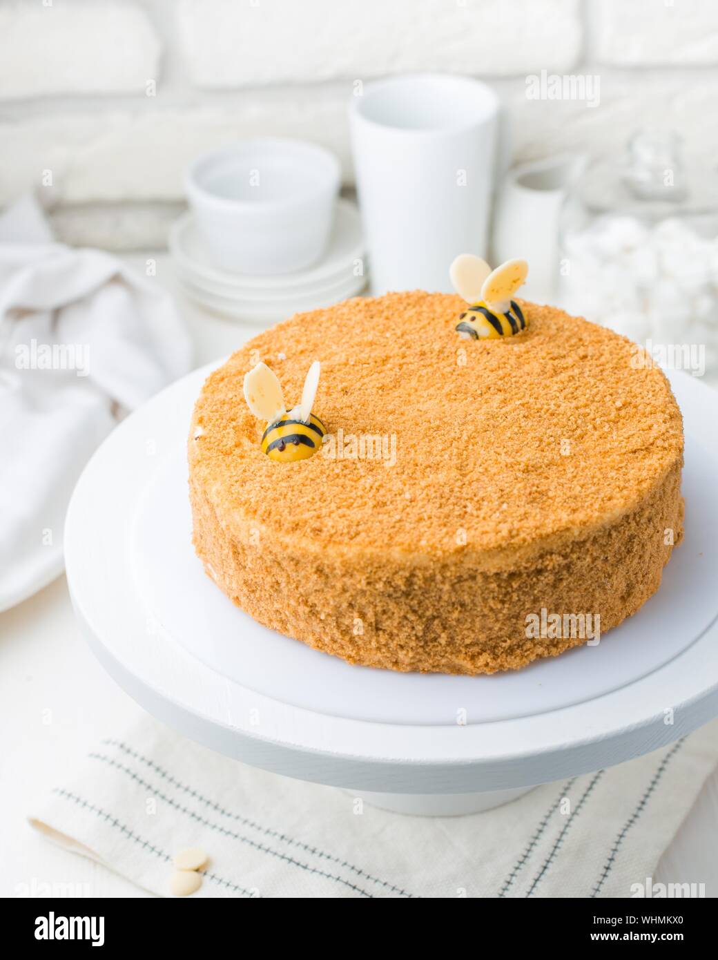 A Vertical Selective Closeup Shot Of An Orange Cake With Bee