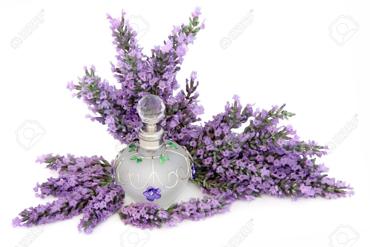 Lavender Herb Flower Sprigs And Decorative Perfume Bottle Over