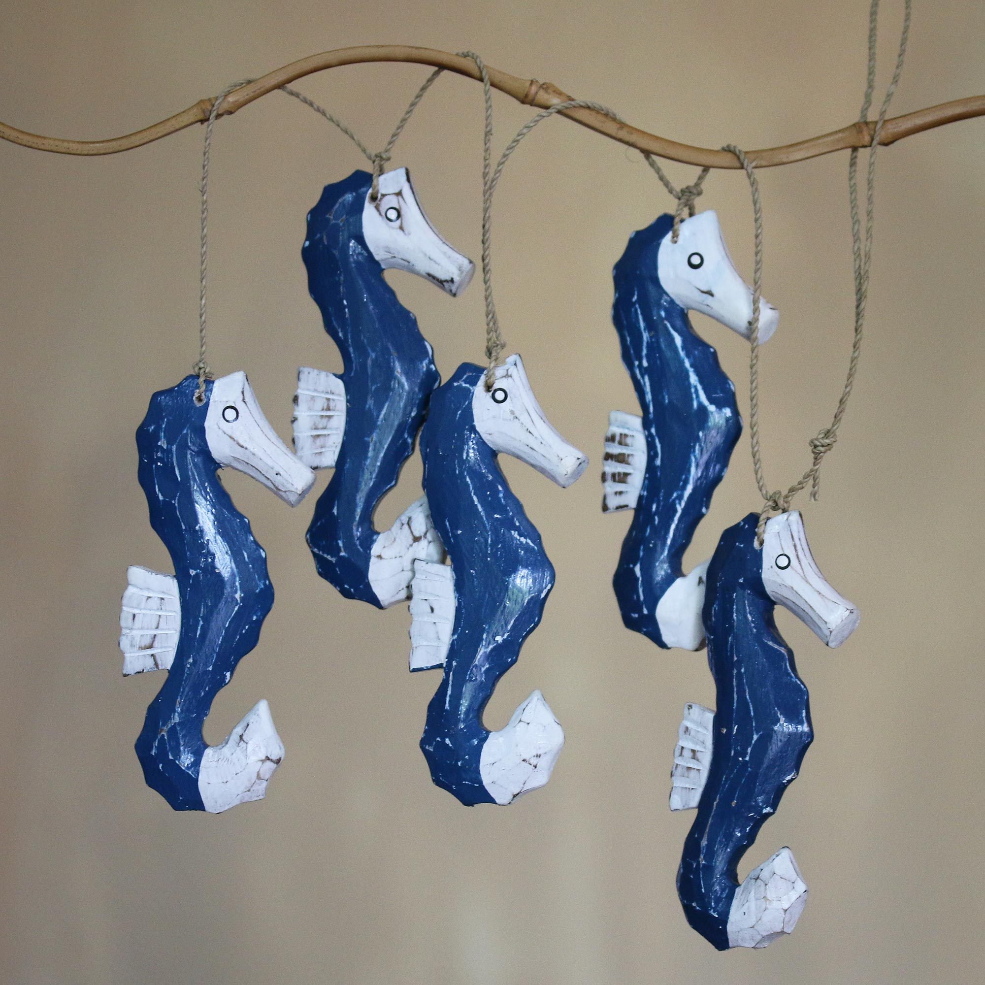 Blue And White Albesia Wood Seahorse Wall Decor Accessory