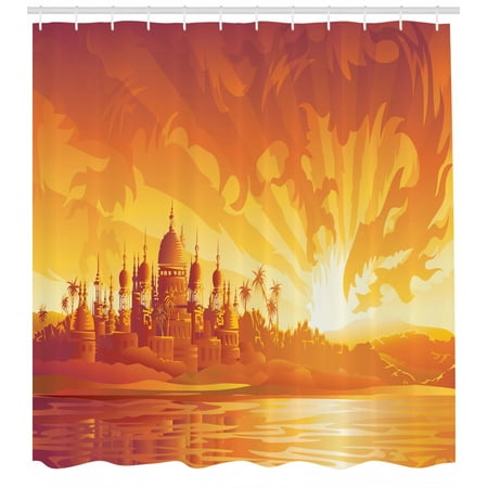 Asian Decor Shower Curtain Set Golden City Under Dragon Fire Sky