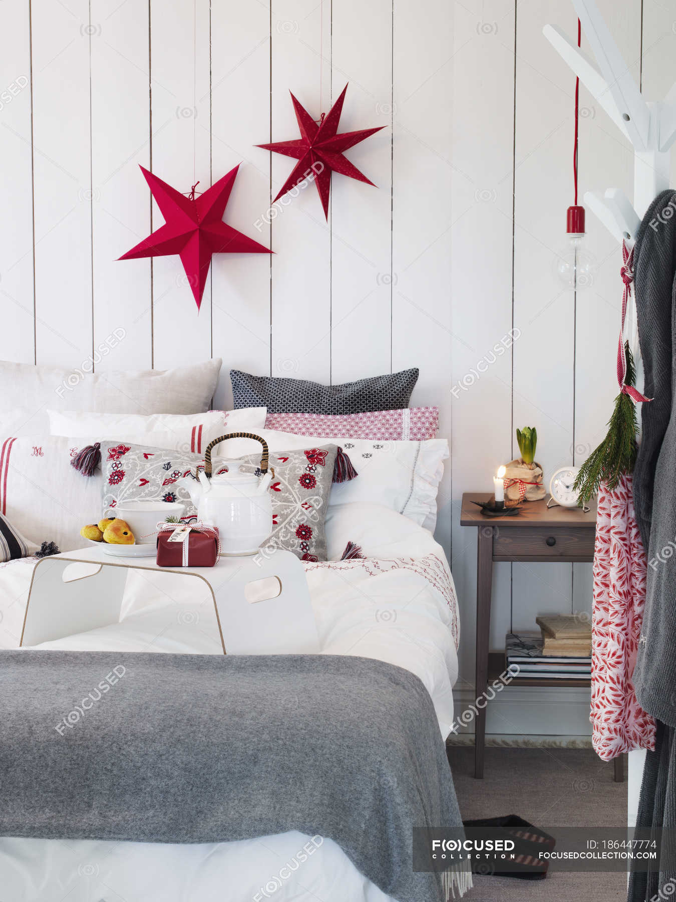 Bedroom With Christmas Decorations And Gift On Bed Home Interior
