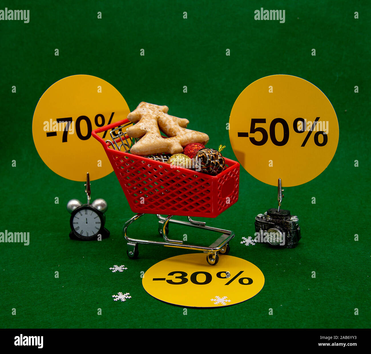 Christmas Sale Shopping Cart With Christmas Decor Stock Photo
