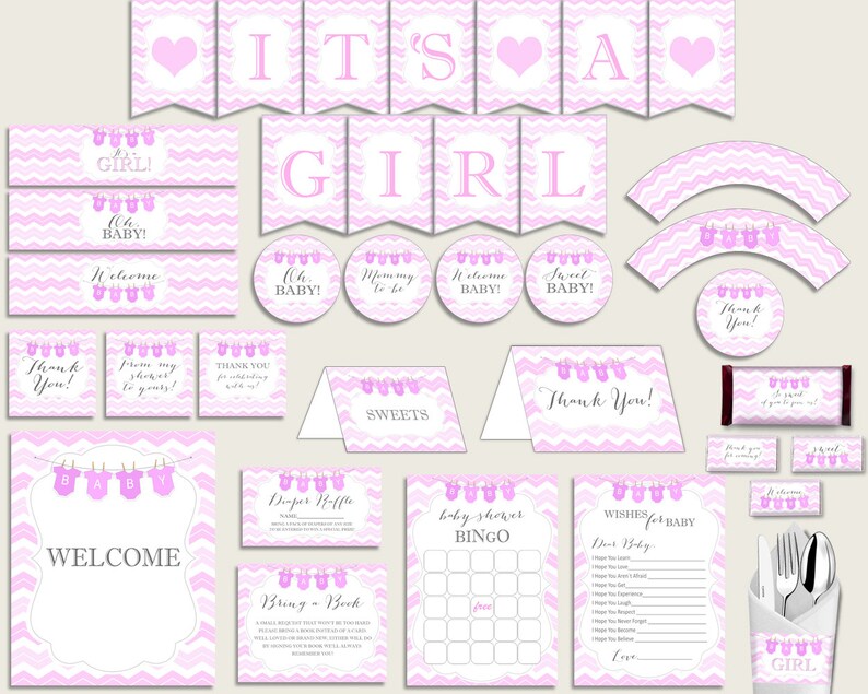 Pink Chevron Baby Shower Party Package Baby Girl Pink Grey