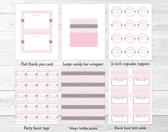 Grey table cloth with this pink chevron runner with these center pieces. Printable pink and gray elephant baby shower water bottle wrappers. Shop pink tissue paper pom pom decorations blue hanging fans and metallic swirls.