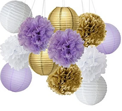 12 Pcs White Purple Gold Tissue Paper Pom Pom Paper Lanterns Mixed