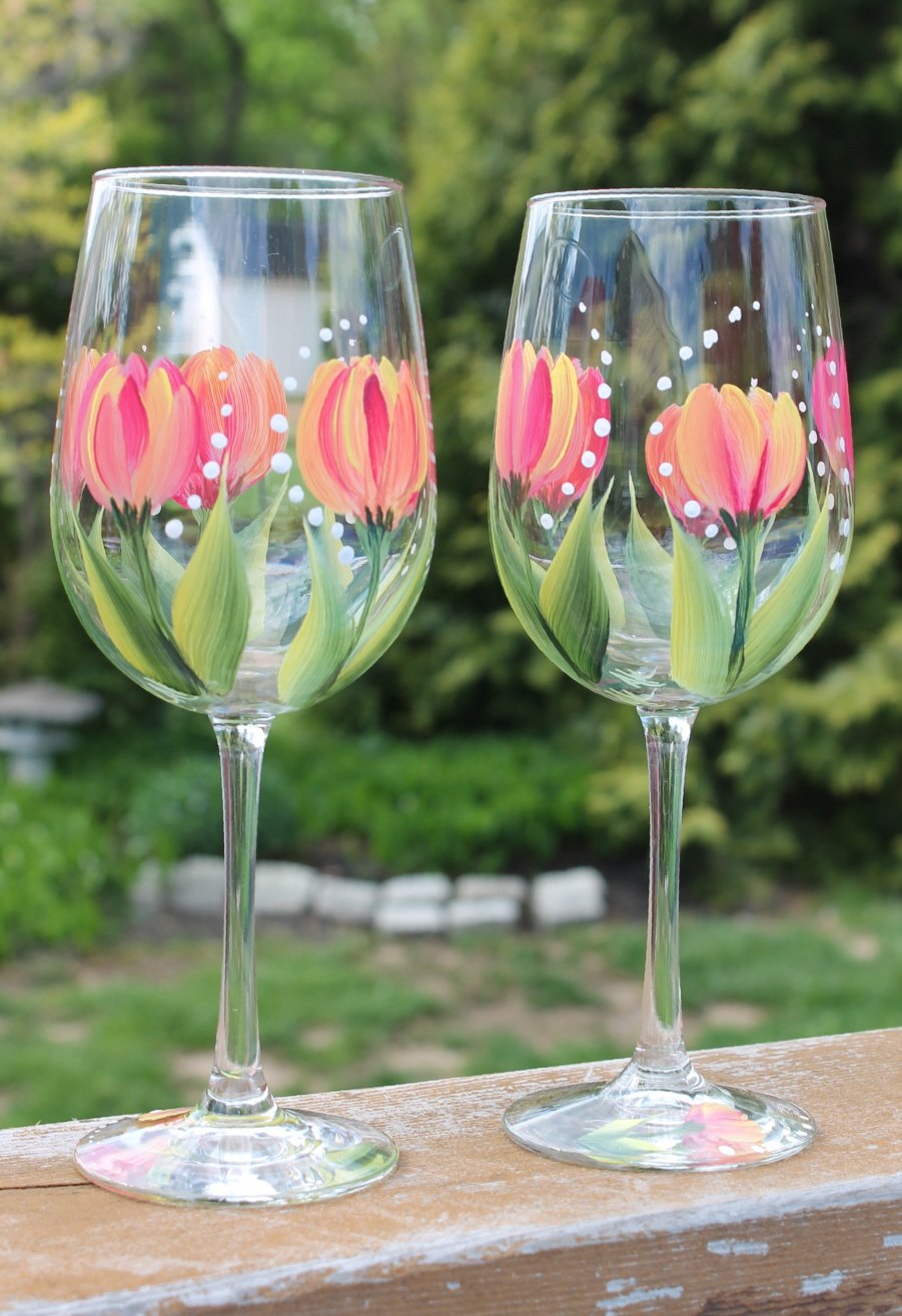 Amazon Com 2 Tulips Flowers Hand Painted Wine Glasses Set Handmade