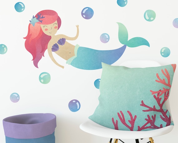 Mermaid Wall Decal Wall Decor Watercolor Mermaid Wall Art Etsy