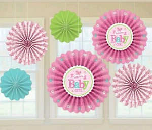 6 Little Pink Welcome Baby Girl Shower Party Hanging Paper Fan
