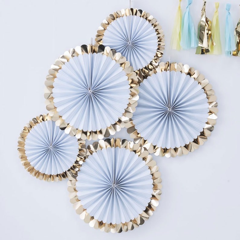 5 Blue Gold Paper Fan Decorations Hanging Fans Baby Shower Etsy