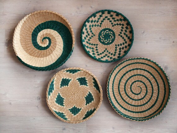 Set Of 4 Wall Baskets Dark Green Beige Wall Decor Boho Decor Etsy