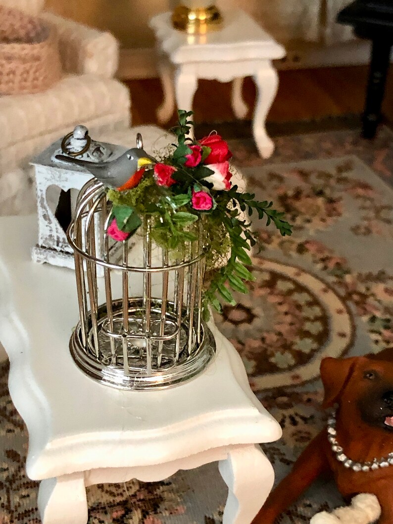 Miniature Decorated Bird Cage With Bird And Roses Dollhouse Etsy