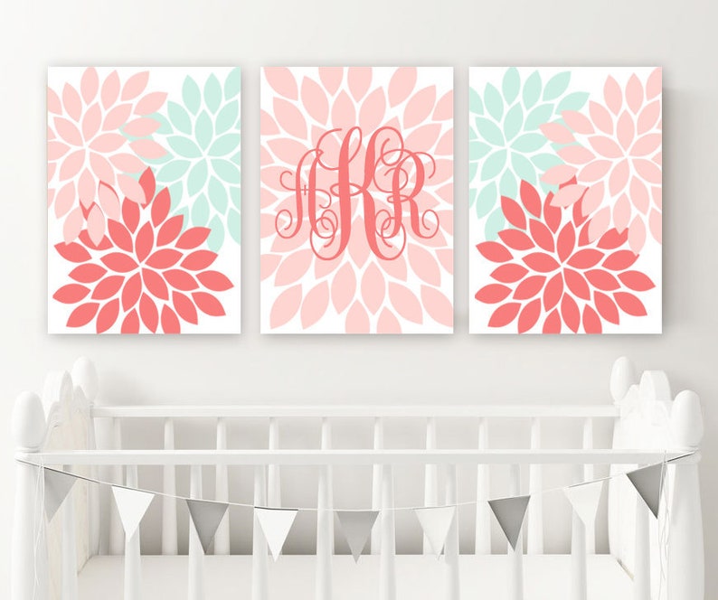 Coral Mint Nursery Wall Art Baby Girl Monogram Decor Coral Etsy