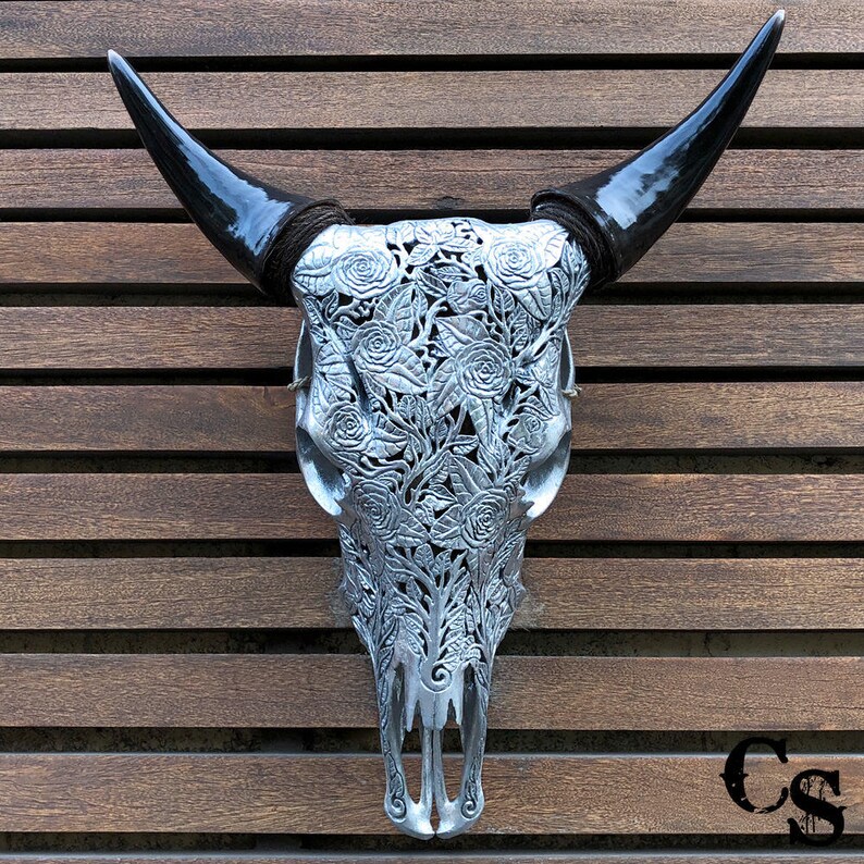 Real Carved Cow Skull Head Roses Design Bull Skull Steer Etsy