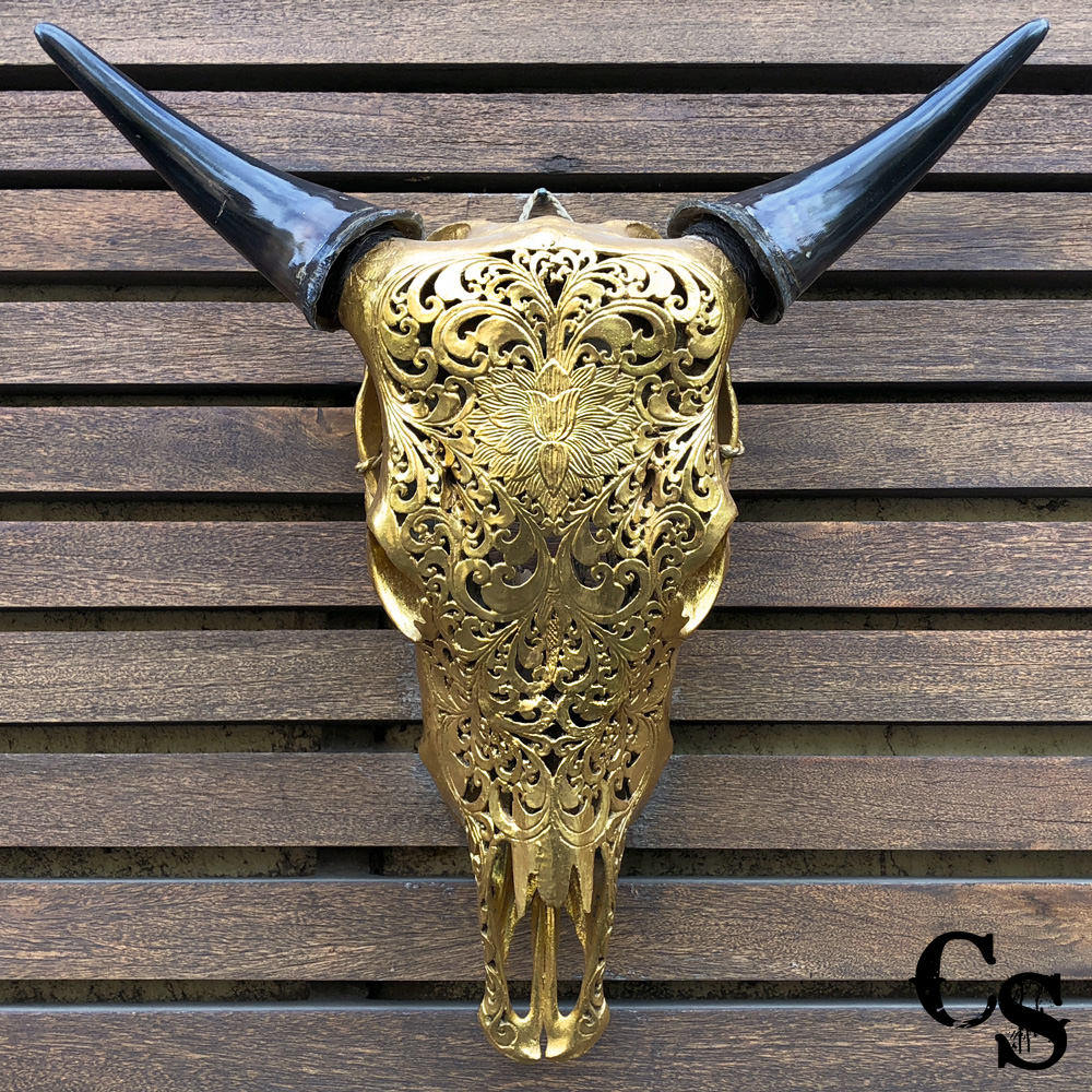 Filigree Carved Cow Skull Decor W Gold Longhorns
