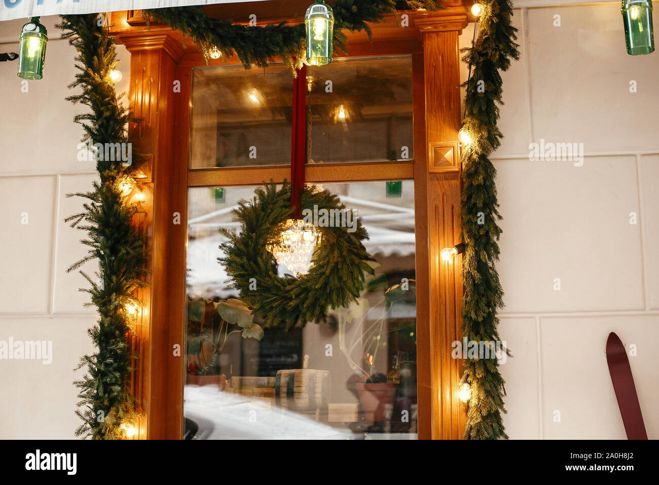 Christmas Garland A Wreath Close Up Around A Window With Shiny