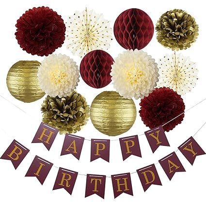 We carry napkins plates cutlery and lots of tableware. Burgundy gold birthday party decorations burgundy gold happy birthday banner tssue pom pom honeycomb balls polka dot fans for burgundy fall birthday party supplies30th birthday decorations. Weve got you covered for every occasion so dont waste timecheck us out.