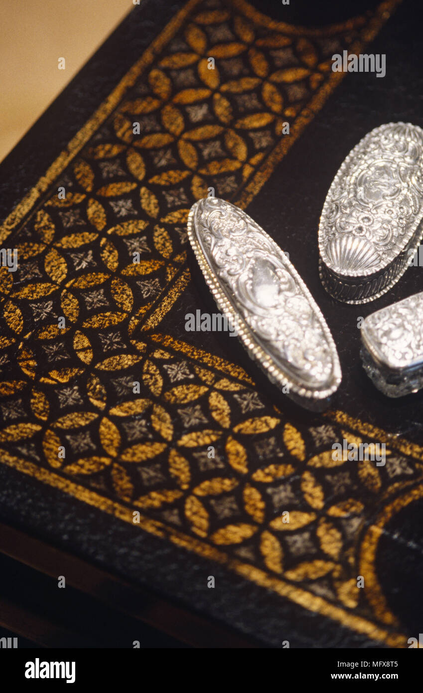 Silverware Pillboxes On Decorative Inlaid Table Stock Photo