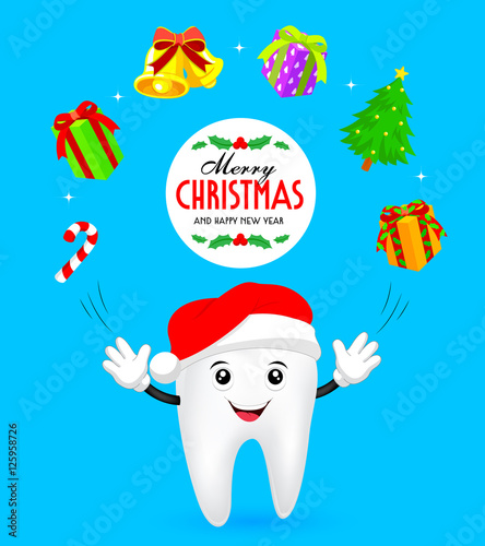 Happy Tooth Wearing Santa Claus Hat Juggles With Gift Boxes And
