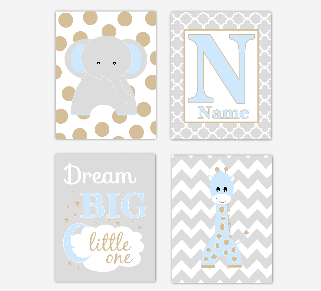 Blue Gold Baby Boy Nursery Art Elephant Giraffe Dream Big
