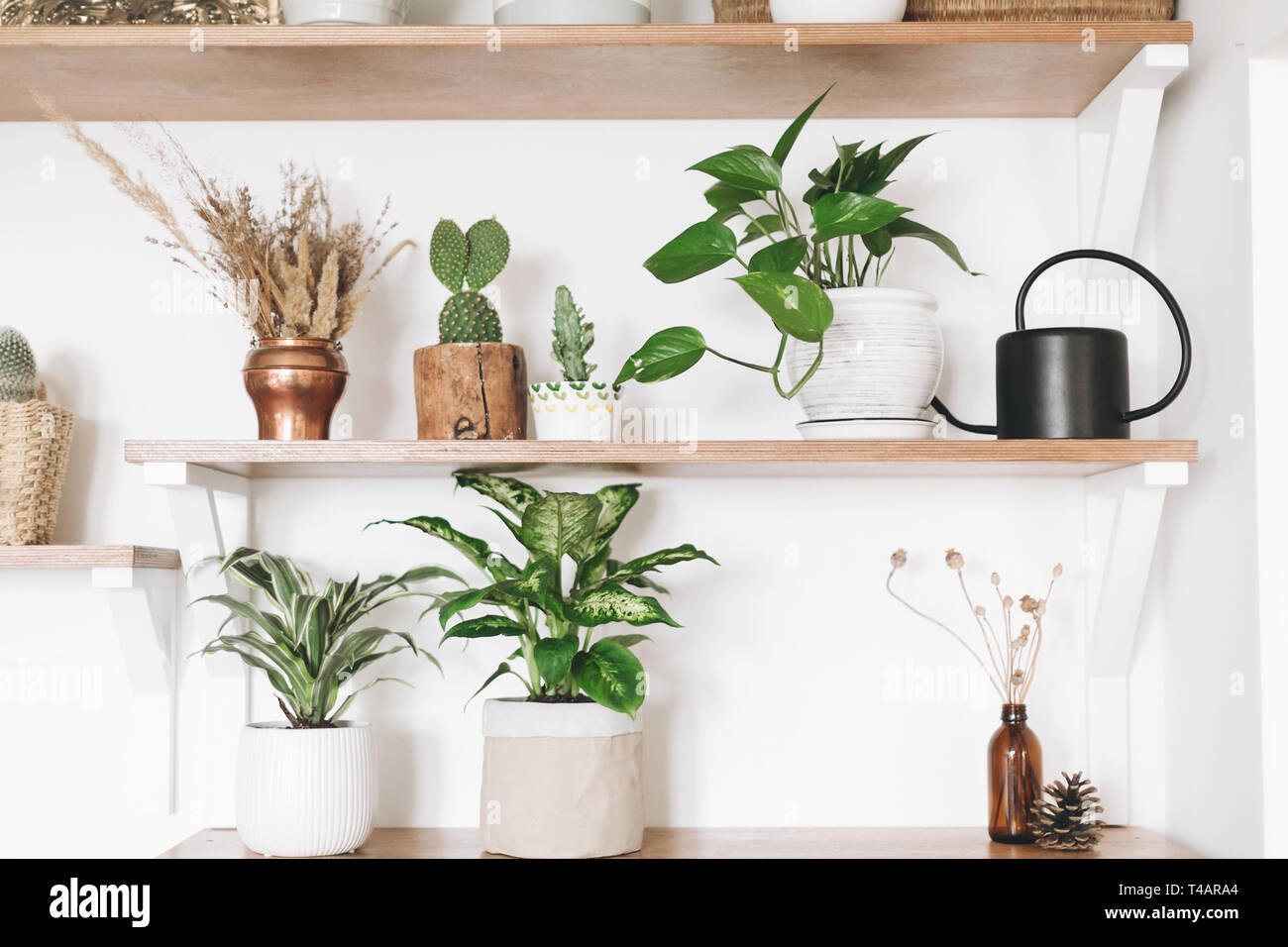 Stylish Wooden Shelves With Green Plants Black Watering Can