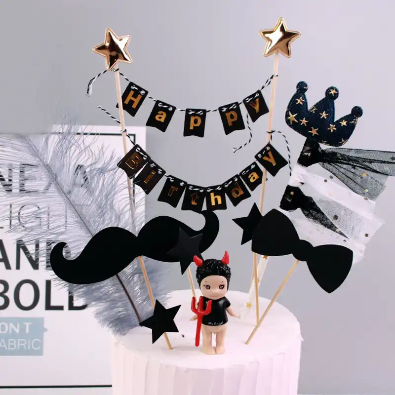 Dark System Cool Black Crown Mustache Cake Toppers Happy Birthday
