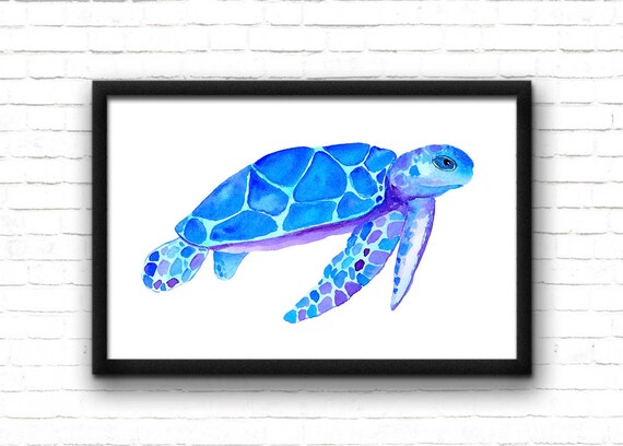 Watercolor Sea Turtle Wall Art Blue Nautical Print Bathroom Etsy