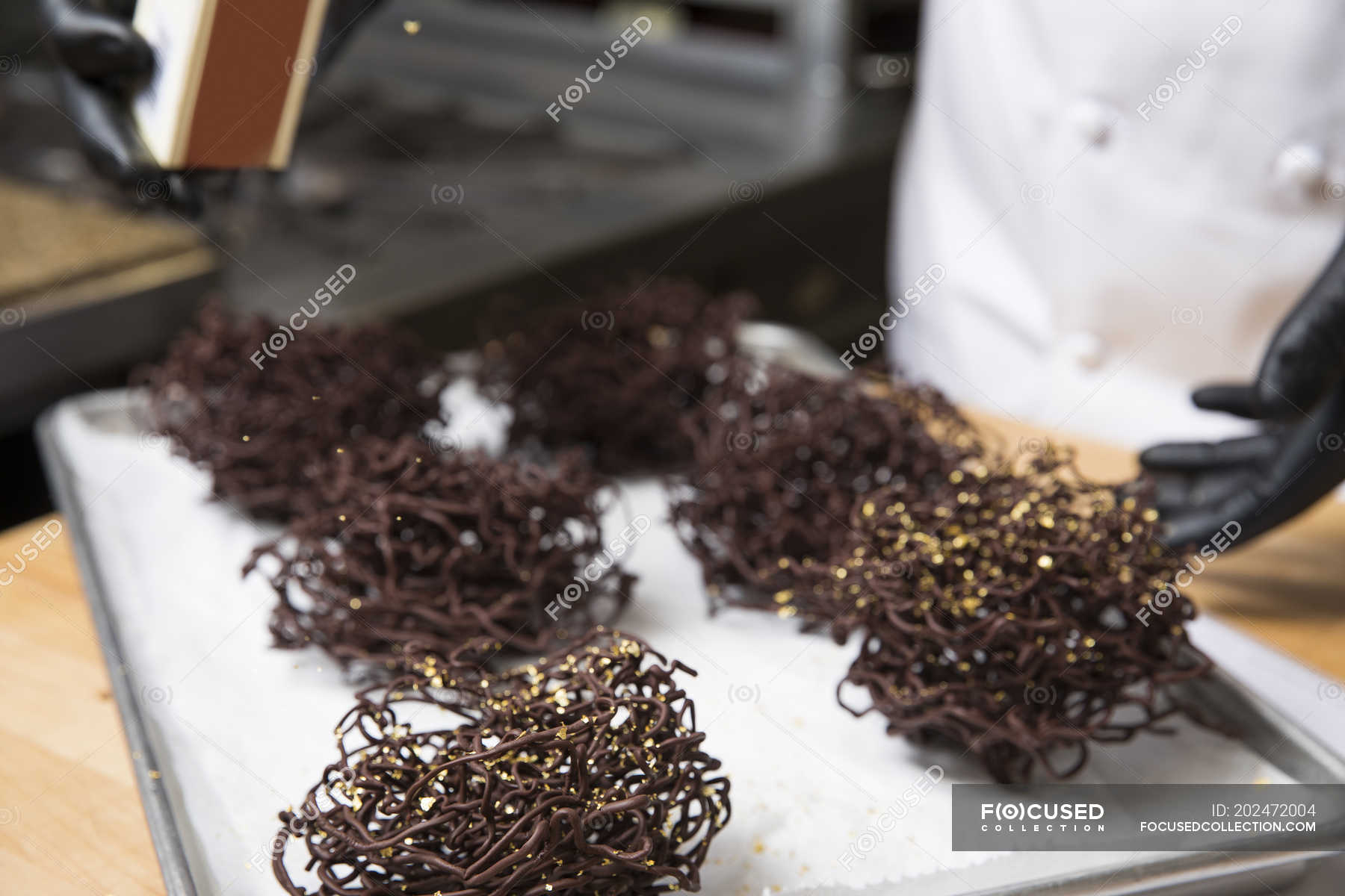 Chef Sprinkling Golden Decorations On Chocolate Nests Selective