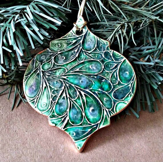 Ceramic Christmas Ornament Peacock Green Edged In Gold Etsy