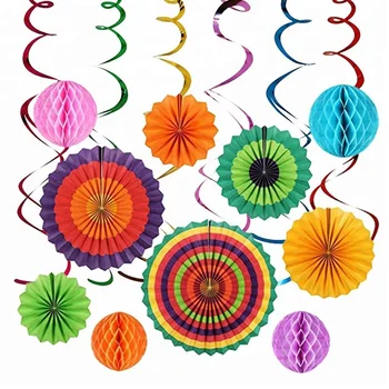16pcs Colorful Hanging Paper Fans Flowers Mexican Fiesta Kids
