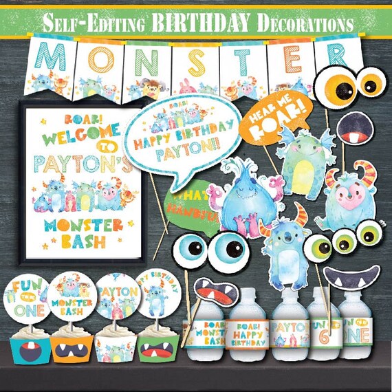 Self Editing Monster Birthday Decorations Printable Monster Etsy