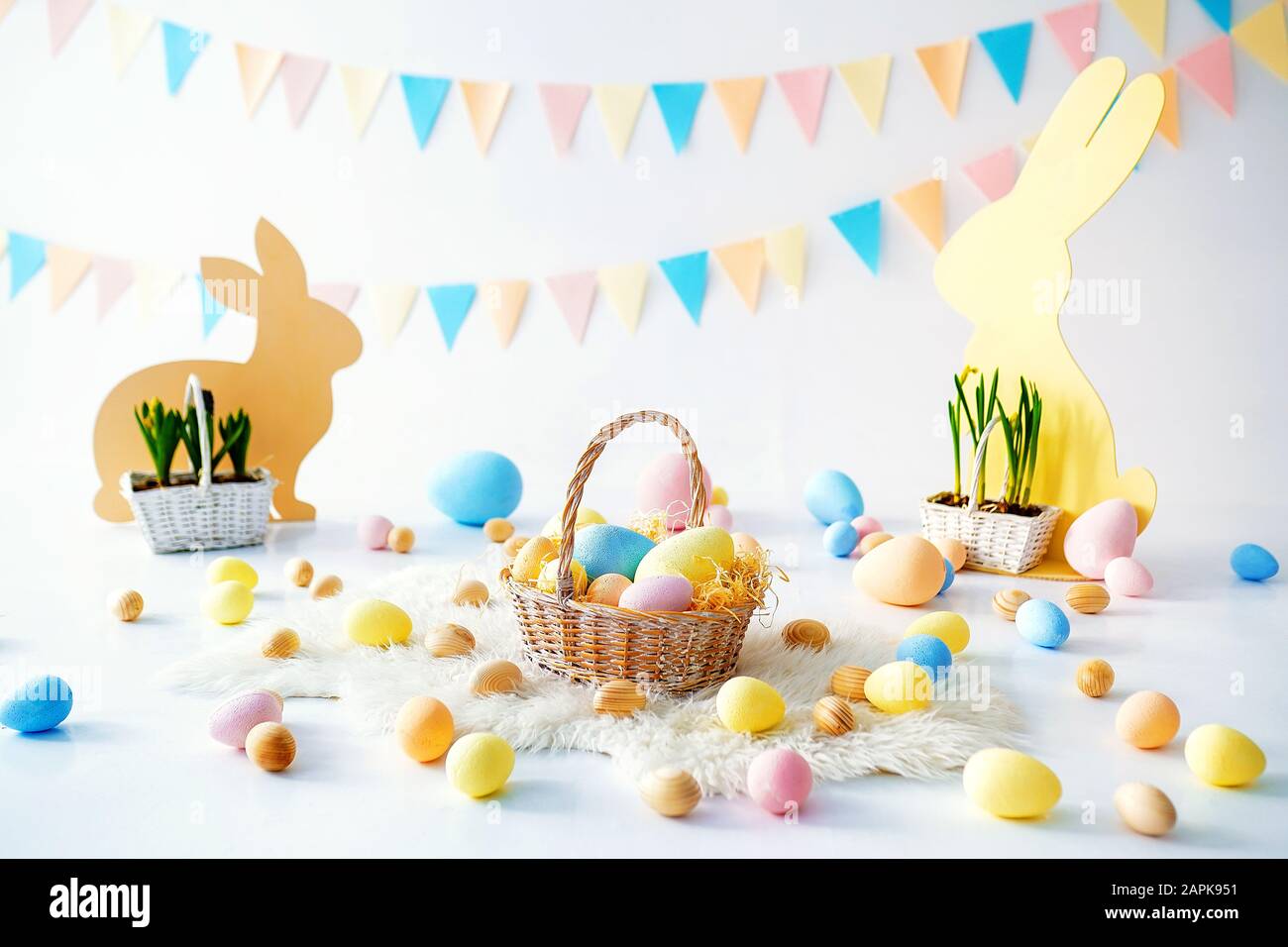 Easter Many Colorful Easter Eggs With Bunnies And Baskets Easter