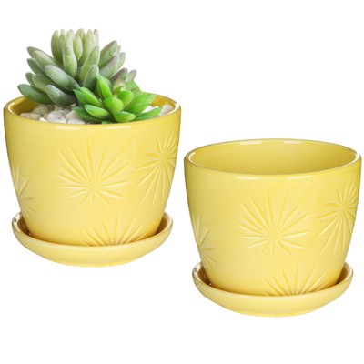 Set Of 2 Yellow Ceramic Flower Planter Pots Decorative Containers