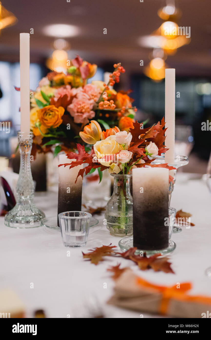 Elegant Wedding Decorations With Flowers And Candles Close Up