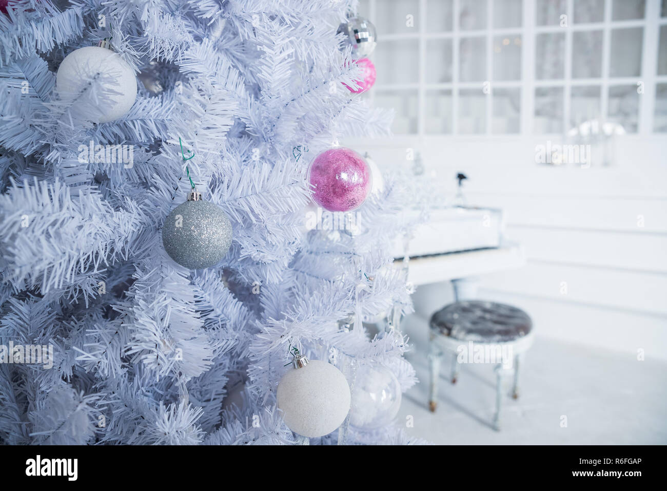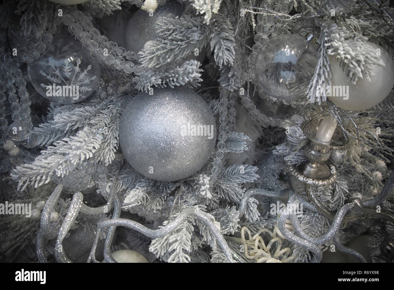 A Close Up Of A White Christmas Tree With Silver Ornaments Stock