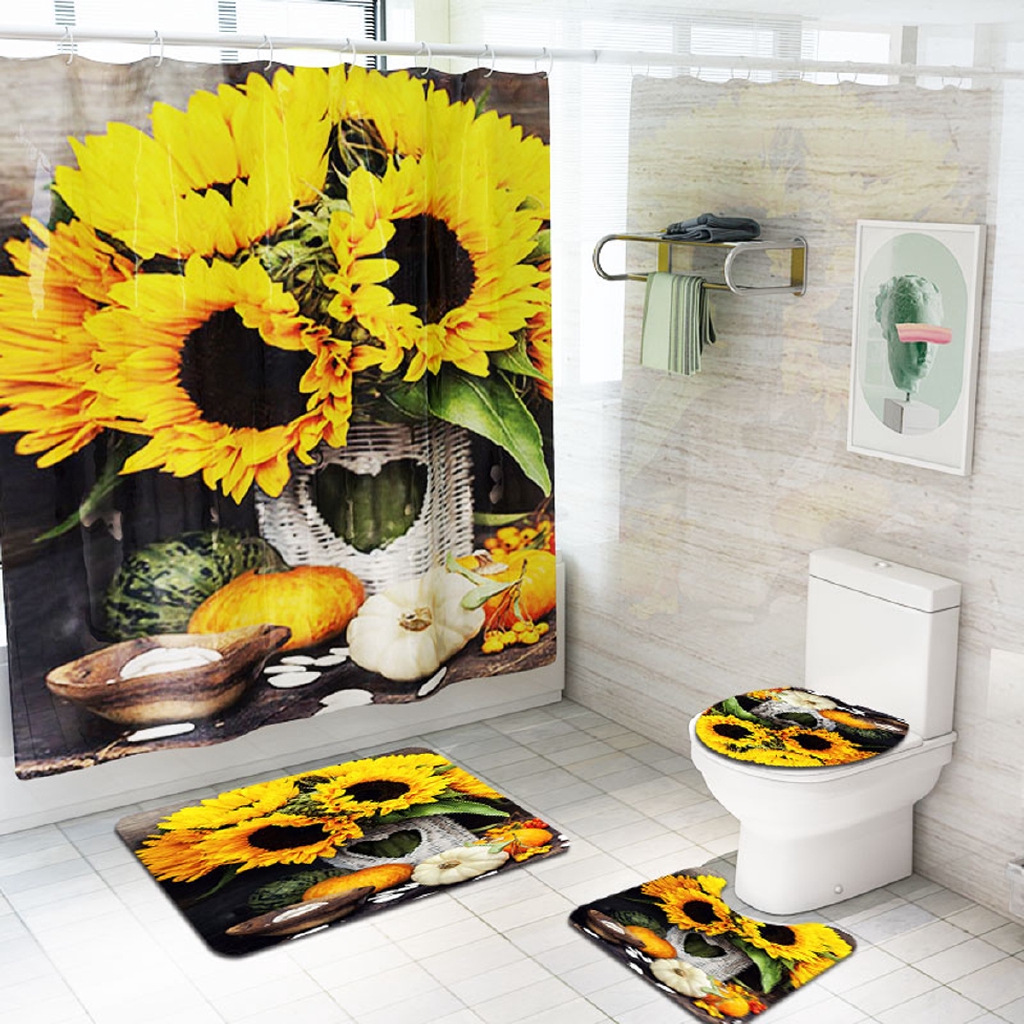 Sunflower Art Print Shower Curtain Non Slip Pedestal Rug Toilet